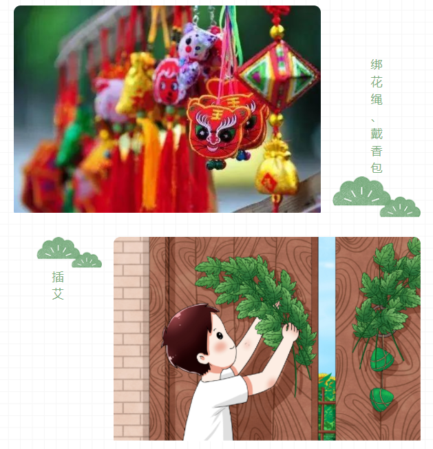 端午节还有一个插艾的习俗,这个习俗来源于一个古老的传说。在唐朝末期,黄巢带领着起义大军,浩浩荡荡、南征北战,一路上杀富济贫,由于当时通讯条件落后,农民根本无法和黄巢、起义军取得联系,最后,黄巢想出了一个办法,在起义那天,让农民家家户户以艾为信号,插在门上。后来慢慢地,插艾就有了“驱魔辟邪”的说法。