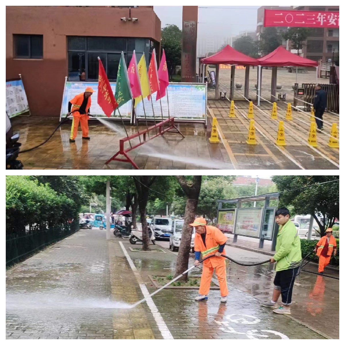 临泉项目部组织环卫人员开展考点周边环境优化整治,集中力量对考点周边主次干道、人行道实施精细化冲刷,确保考点周边环境整洁有序。